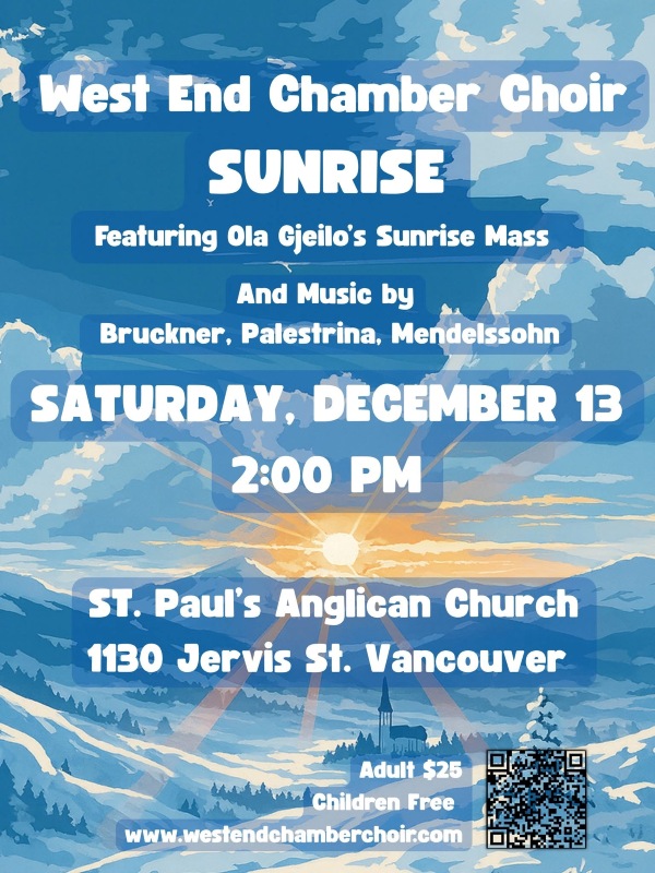 Скъпи приятели, Заповядайте на зимния концерт на West End Chamber Choir с диригент Наталия Манолова! Тази събота, на 13 декември от 14.00 часа ще имате удоволствието да слушате цялото произведение “Sunrise Mass” на съвременния композитор Ola Gjeilo със съпровод на струнен квартет, както и музика на Брукнер, Палестрина и Менделсон. St. Paul’s Anglican Church 1130 [...]