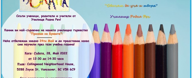 Dear students and teachers, parents and friends of the Bulgarian school "Rodna Rech", We would like invite you to our school celebration "Holiday of the Letters"! The students are eager to share what they have learned during the school year and will be excited to celebrate the day of the Bulgarian alphabet, May 24th, together [...]